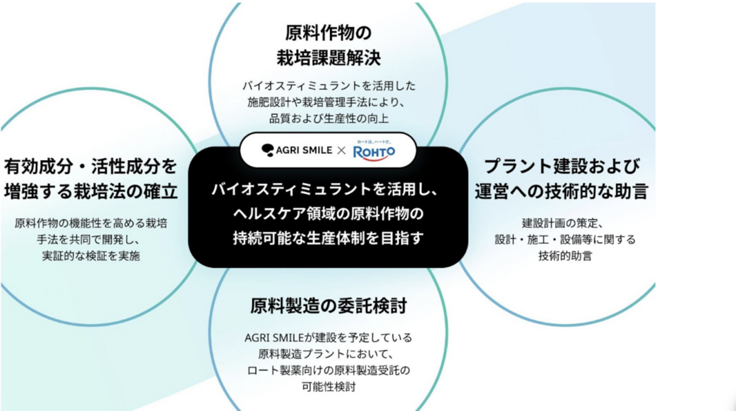 AGRI SMILEが建設を予定している原料製造プラントにおいて、ロート製薬向けの原料製造受託の可能性を検討します。 - プラント建設および運営への技術的な助言