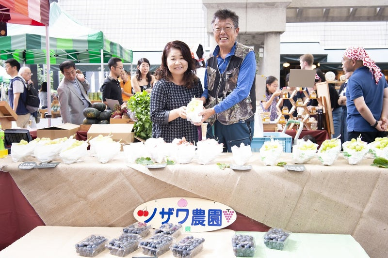 それぞれの居場所でありライフスタイルと言いましたが、マルシェの始まりであり根幹である「農家にとっての売り場確保」が私の仕事としても重要な要素になります。ヒルズマルシェでも、8年以上出店してくれている農家さんが多数います。たまにの出店ではなく、売る商品があるシーズン中は毎週出続けたり、月1回は来てくださったりするレベルです。こちらの素敵なご夫婦、山梨県南アルプス市のノザワ農園さんもその一人です。
