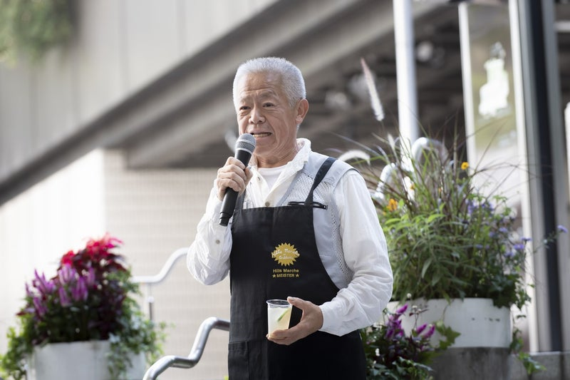 セレモニーといっても大それたことはせず、主催の森ビル株式会社の担当者や、自治会の会長などの挨拶をいただき、そしてヒルズマルシェに10年ほぼ休むことなく出続けてくださっている、まさに農家のためのマルシェを体現してくださる、レジェンド、東京都国分寺市の小坂農園の小坂さんに乾杯の挨拶をいただきました。