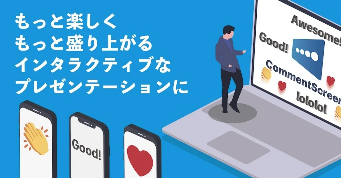 CommentScreenは、冨平の「もっと授業を面白く聴けるようにするにはどうしたら良いのだろう」という問題意識から始まったサービスで、見ている人がプレゼン画面にコメントやエモーションを入れ、プレゼン自体を面白く盛り上げることができます。