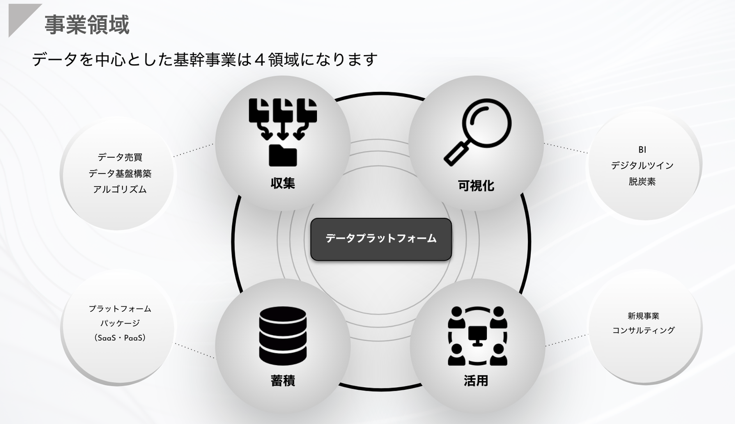 "データプラットフォームを用いてビジネスの価値を最大化・最適化する” をミッションに掲げ データ・AIを利活用することであらゆるサプライチェーンデータやネットワークを管理し、DX推進において最も核となる部分をインハウス化することでノウハウの蓄積・ワンストップでの価値提供を実現しております。