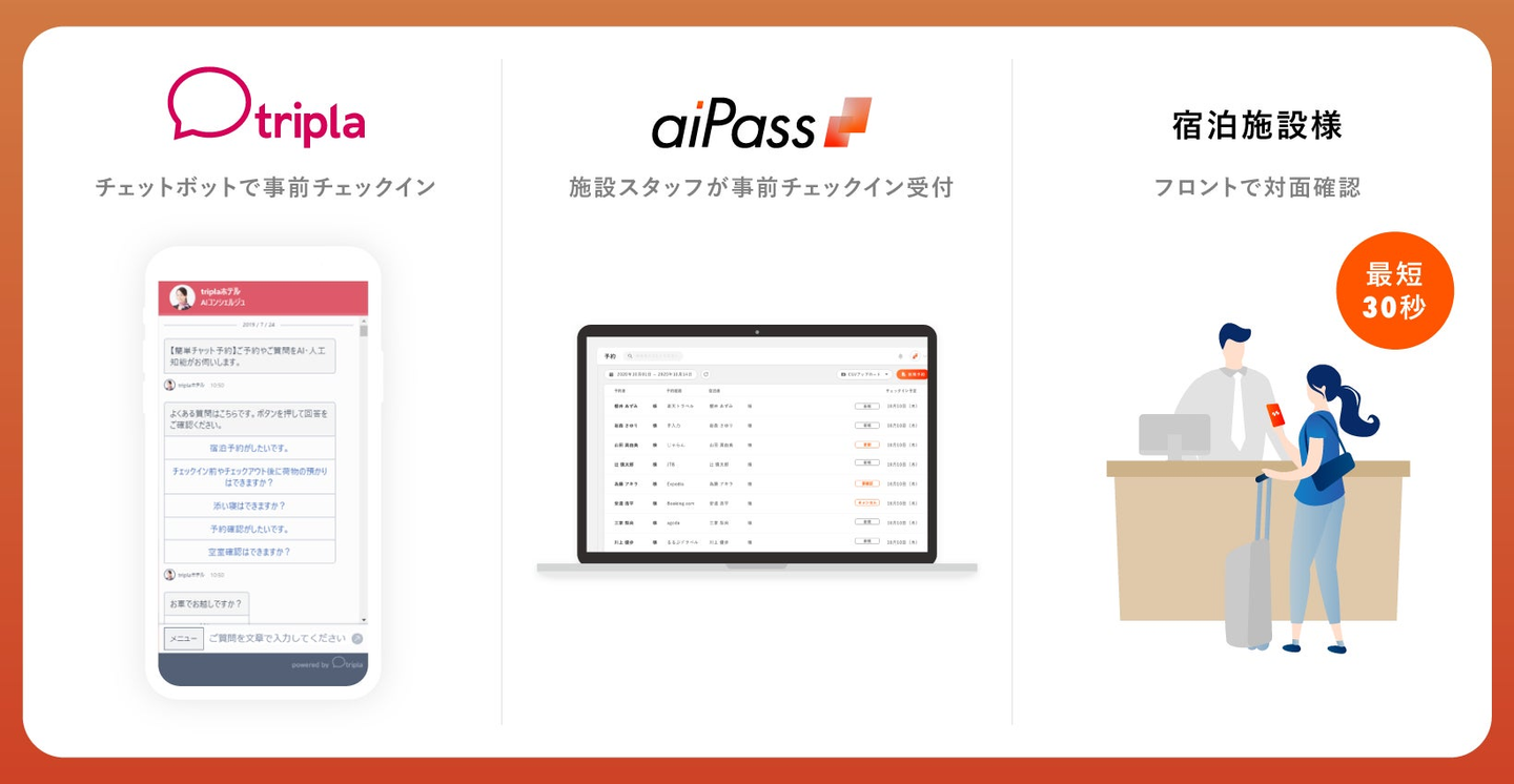 そしてこの度、トリプラが提供するAIチャットボットと連携することで、旅行者はチャットボット上でより簡単に事前チェックインが可能になるほか、宿泊施設では接触機会の多いフロント業務を非接触かつ効率化し、宿泊施設・旅行者の双方にとって安心・安全で快適な旅行体験を提供することができるようになります。