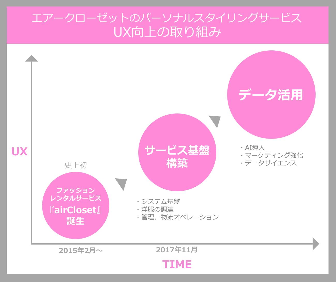 今回の資金調達では、当社の3つのパーソナルスタイリングサービス基盤の拡充に加え、マーケティングの強化、画像認識技術や選好情報の解析などのAI・データサイエンスの活用を進めます。具体的には、当社がこれまでに蓄積したデータやパーソナルスタイリングのノウハウを最大限活用することで、スタイリング精度の向上、ひいては『airCloset』を使う全ての方のUXの向上を実現します。