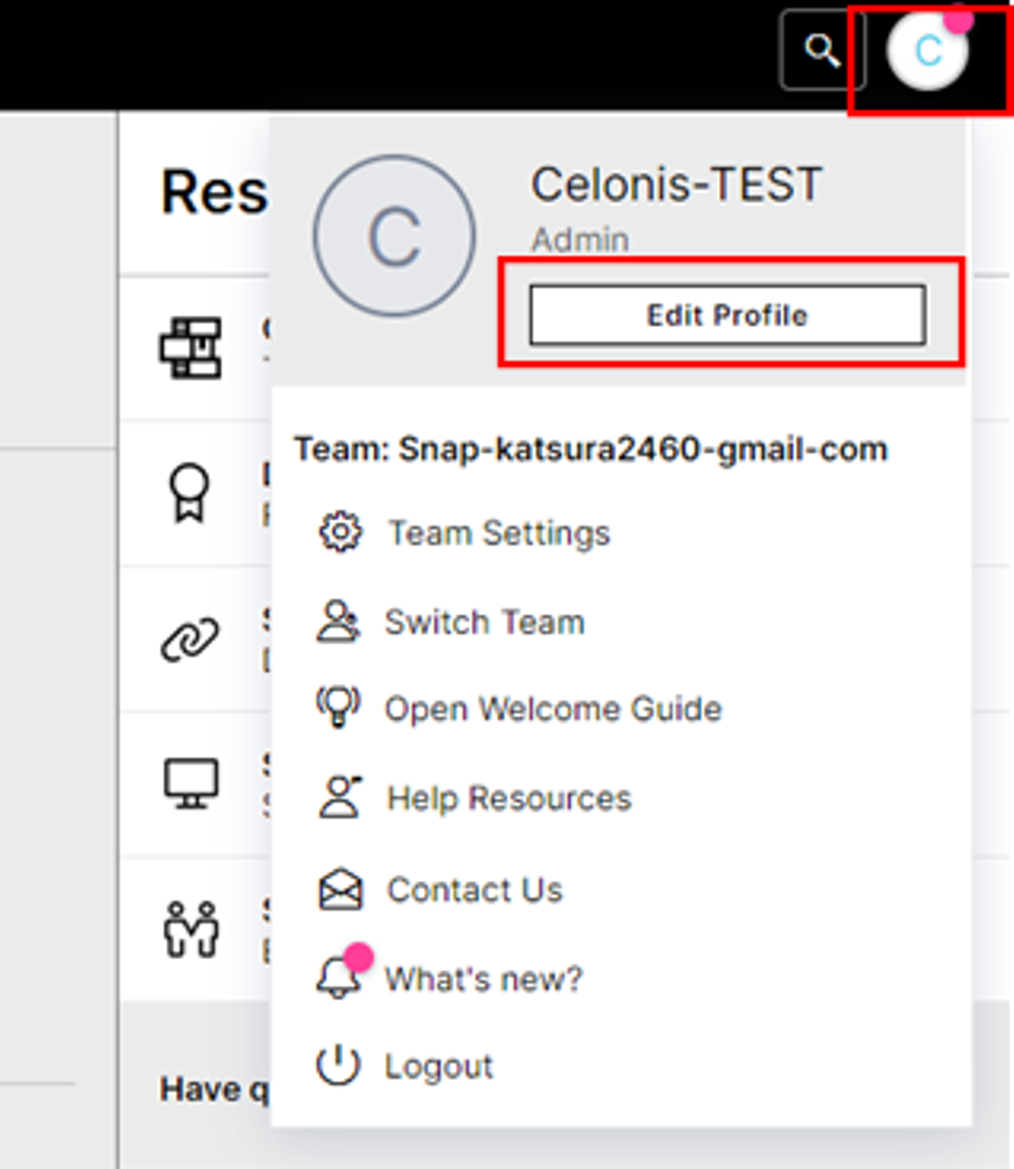 Celonis Snapの画面右上にある○アイコンをクリックすると、「ポップアップ」メニューが表示されます。「ポップアップ」メニュー内の「Edit Profile」ボタンをクリックします。