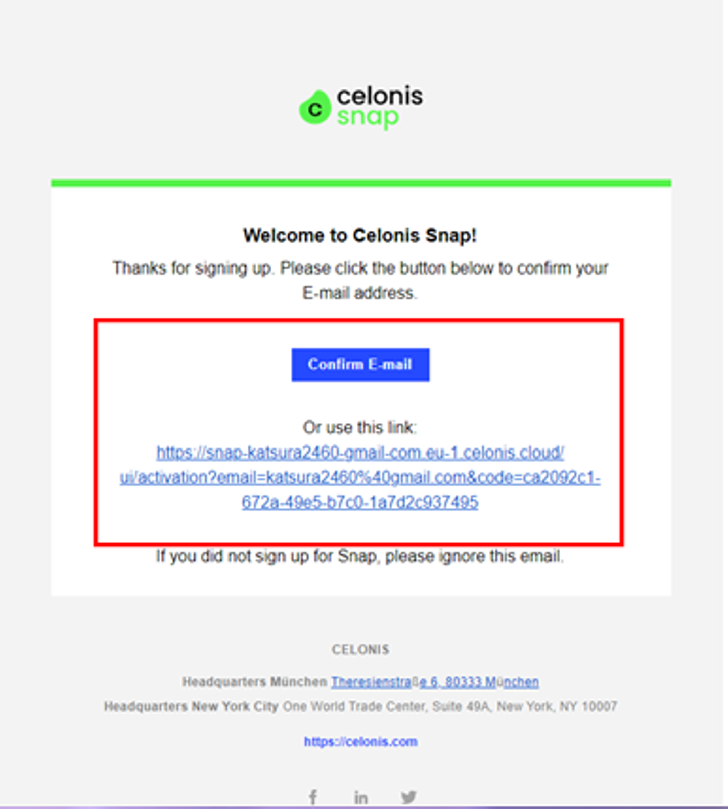 メール内のアクティベーションメール内の「Confirm E-mail」ボタンもしくはCelonis Snapへのリンクをクリックします。