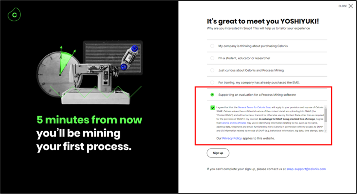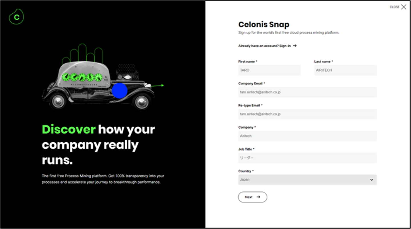 参考 CelonisSnapユーザー登録 画面