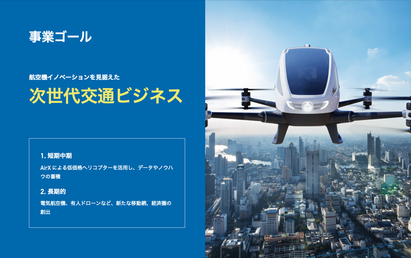 事業ゴールは、『航空機イノベーションを見据えた次世代交通ビジネス』