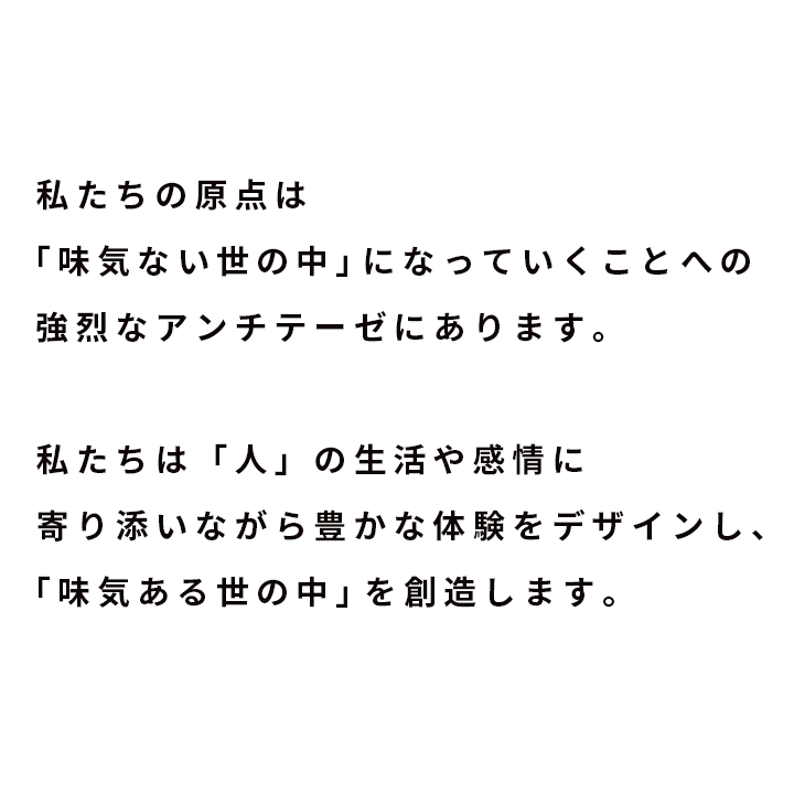 どんな時代でもあくまで人が中心となり、人に寄り添い豊かな体験のデザインすることで「味気ある世の中」をつくりたい。そんな想いをミッションステートメントに込めました。