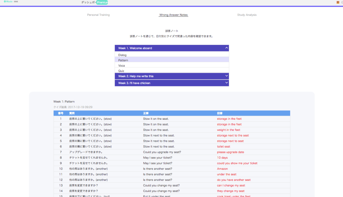 これまでの勉強結果から、苦手な単語や表現パターンからトレーニングセッションを作り、それをMusioと練習したり、専用オンラインページで確認することができるのです!