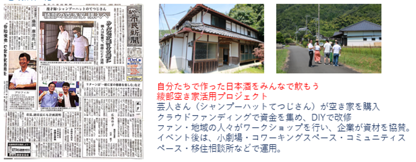 また、最近の面白い取り組みとして、シャンプーハット・てつじさんのクラウドファンディング「てつじの空き家再生プロジェクト(https://silkhat.yoshimoto.co.jp/projects/1958)」にも全面協力させていただいています。
