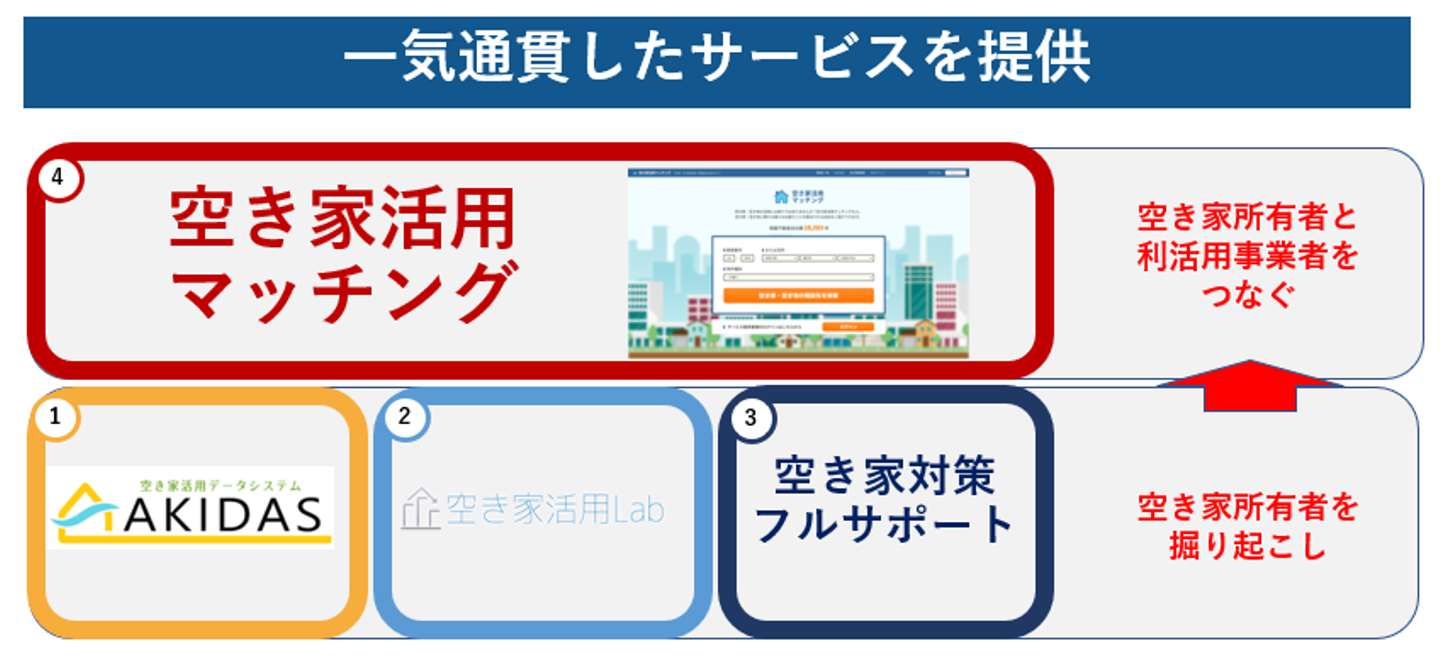 空き家所有者と空き家利活用希望者・事業者が抱える課題の解決を通じて、空き家流通を効率的に促進し、最終的には空き家活用マッチングのプラットフォーム構築を目指す