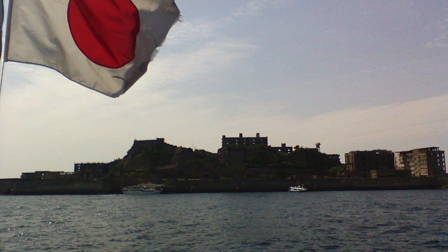 軍艦島を横目で見ながら、船は進む中、隣にいた先輩経営者に