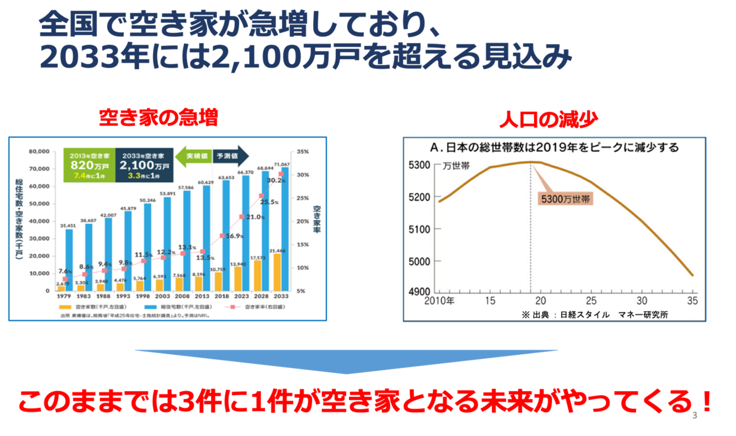 平成30年の最新調査では、全国に848万戸空き家があり、このまま増え続ければ、2037年には2100万戸になる。さらに、2019年をピークに総世帯数が減っていく。