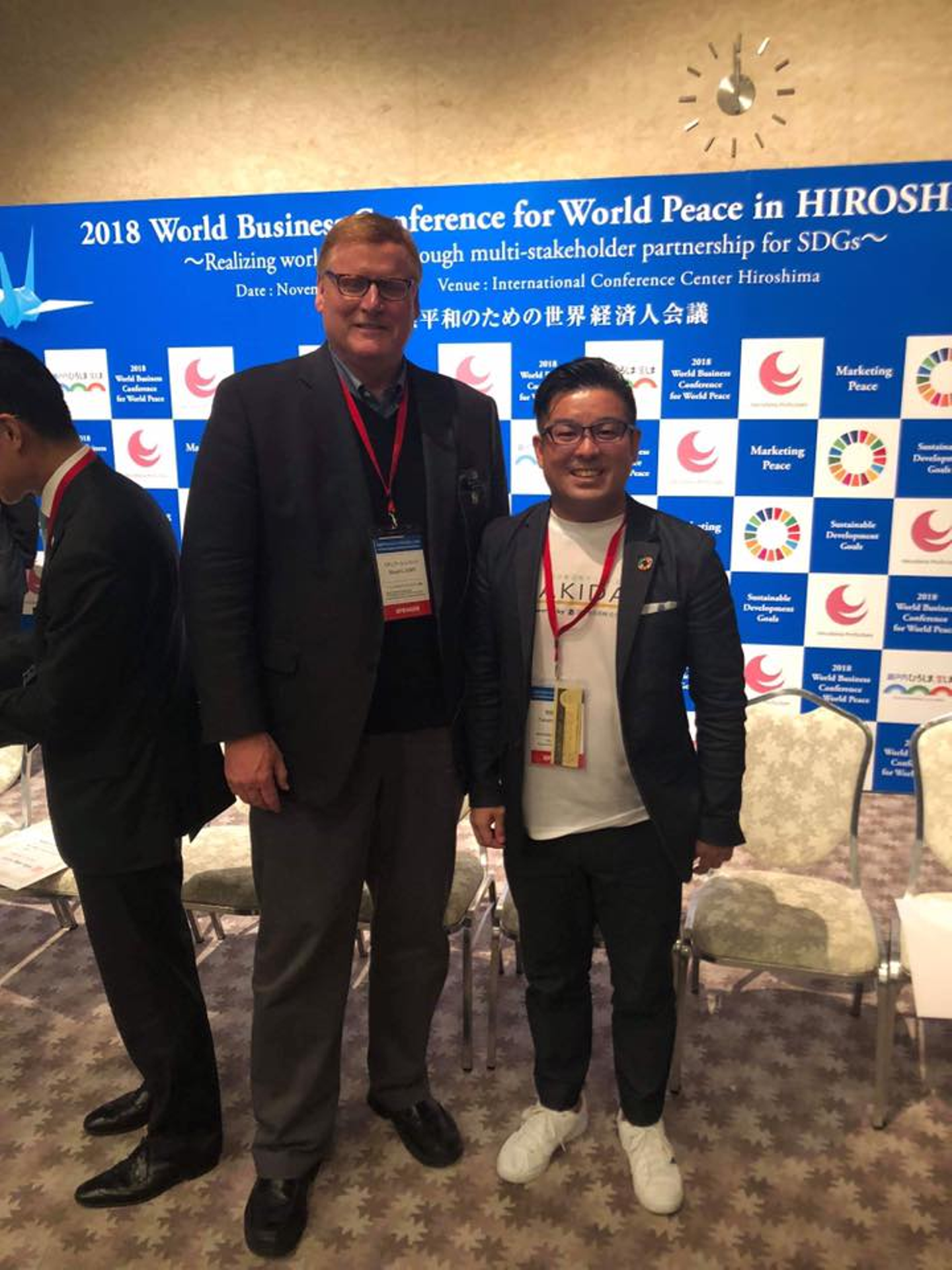 この写真は、広島で行われた【広島SDGsビジネスコンテスト】でのピッチ後、審査員のスチュアート・ハート教授とのツーショット。とても笑顔で素敵な写真です。