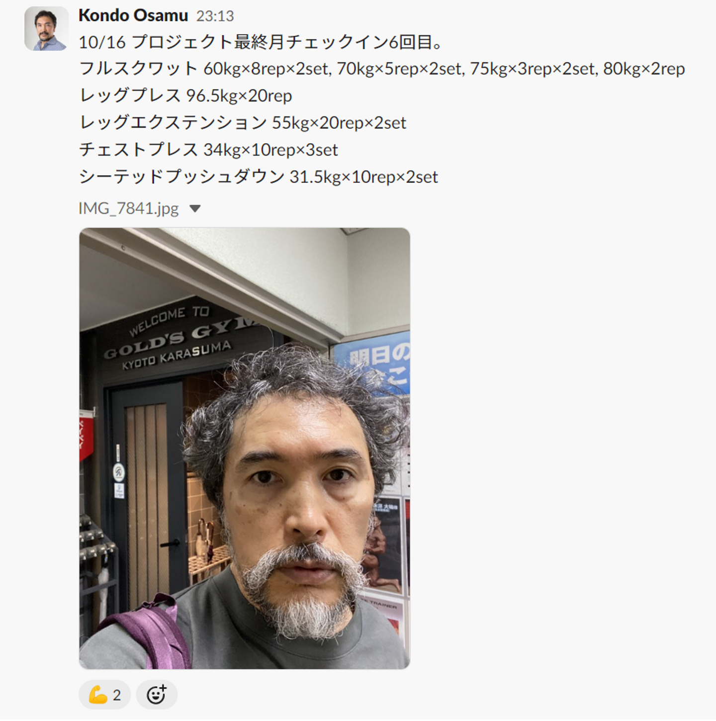 →こんな感じでジムのチェックイン画像をSlackで共有しています。
