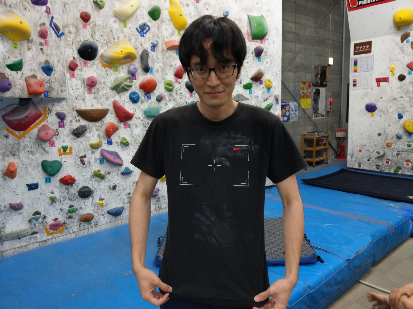 黒い服を着てボルダリングに挑むと、いつの間にかこのように多数の手形がTシャツに浮かんできます。