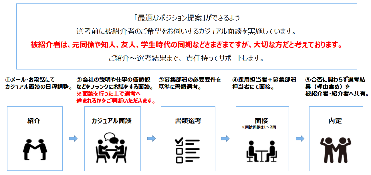 制度を利用することで、被紹介者は確実に採用されるということは無く、選考の基準は通常の応募時と同様です。ただ、採用時に会社のことを良く知っている知人がいることは非常に心強いのではないでしょうか。