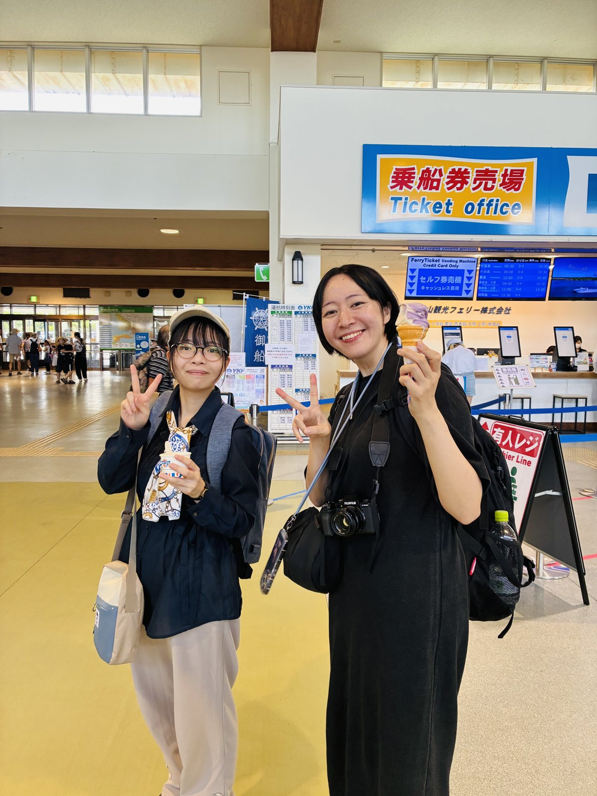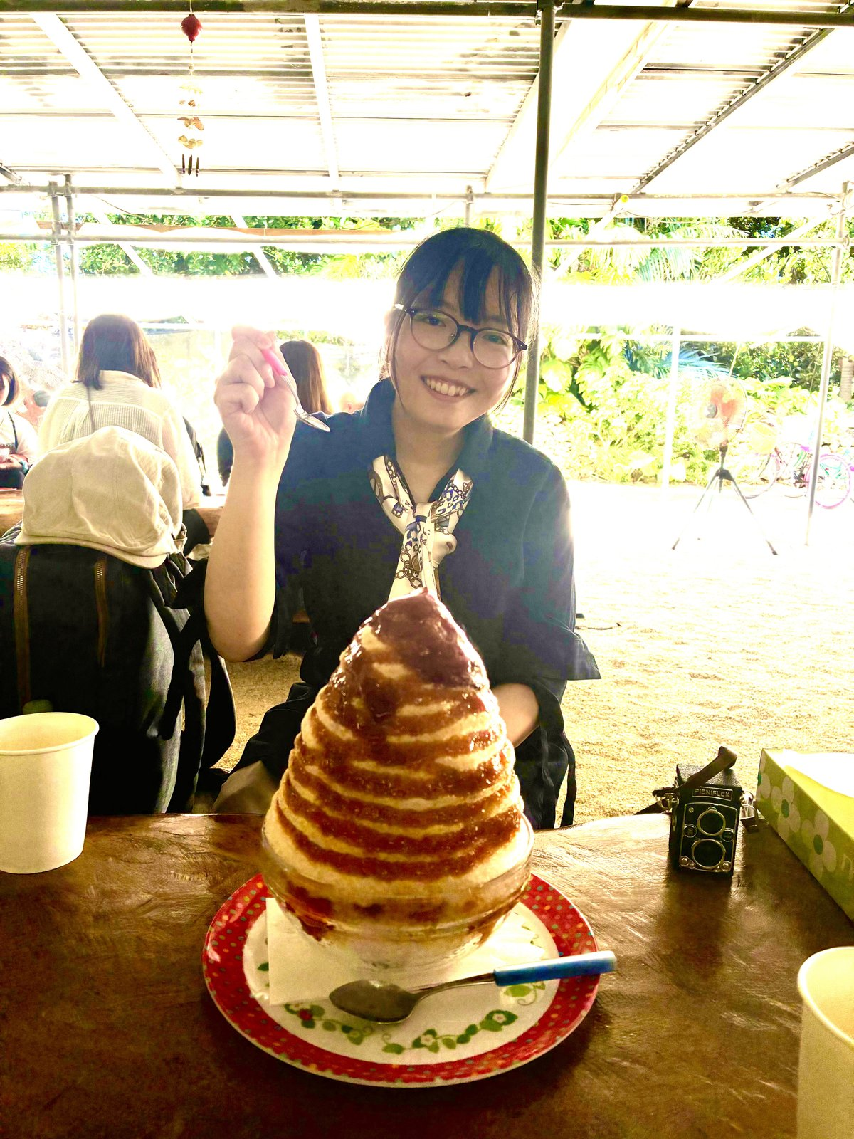 2025年8月の沖縄社員旅行にて。巨大かき氷を前に笑顔の古屋さん。