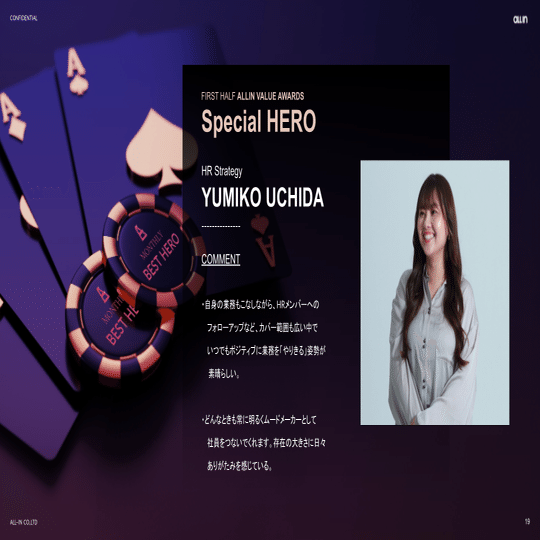 私は堅実なリアリストなので、漠然とした夢や目標を描くのが苦手なんです。でも、「派手で目立つすごい人」にはなれなくても、少しずつ手の届く範囲を広げていけば、「いたら安心・信頼できる人」になれるかもしれない。そのように考える私にとって、Stay Low Key(控えめに、そして気高く)というALL-INのバリューはかなり胸に刺さりました。自分から仕事を生み出す・動かす・先回りすることで、できる仕事を増やしていきたいです。