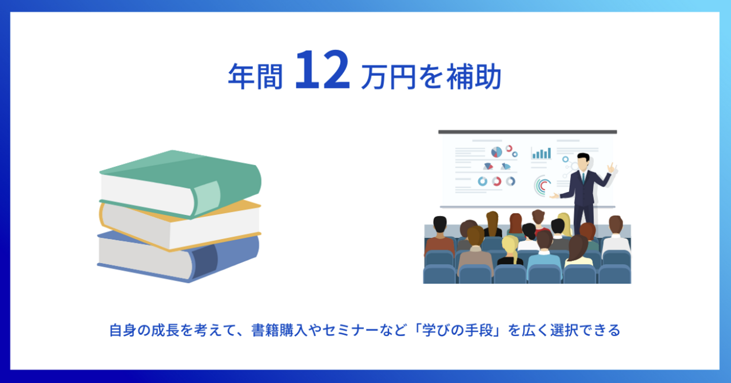 自己啓発制度はその名の通り、メンバー一人ひとりの能力開発を支援するための制度です。自己啓発となる活動を広く支援しているため、書籍購入・研修受講・オンラインスクール等、利用用途は多岐にわたります。