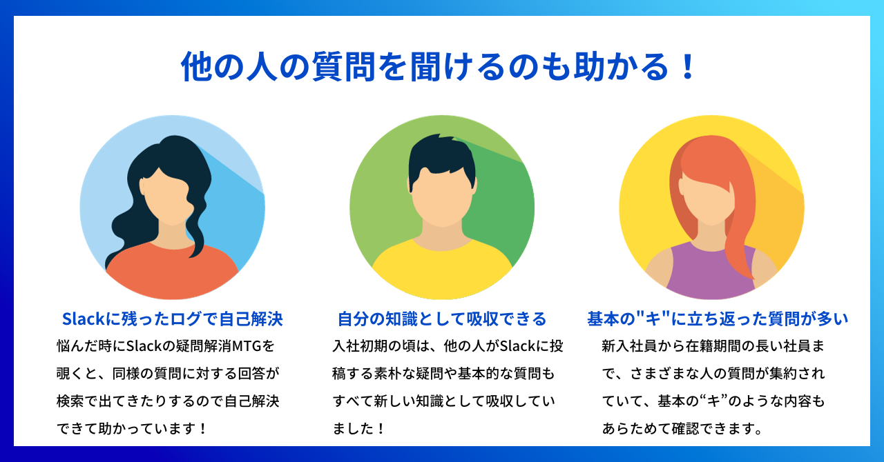 その想いの通り、疑問解消MTGでは「何でも聞いてOK」。入社時のオンボーディングでは賄いきれない「素朴な疑問」を、しっかり拾うという役割を果たしています。