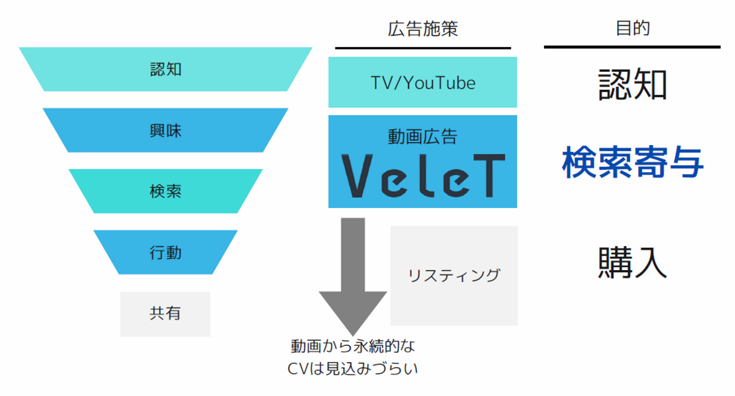 リーチ指標だけでは獲得寄与が見えづらく、動画広告のみでの直接的なコンバージョンは見込みづらいため、「検索寄与」を計測するためのビュースルーサーチを用いることが大事になってきます。