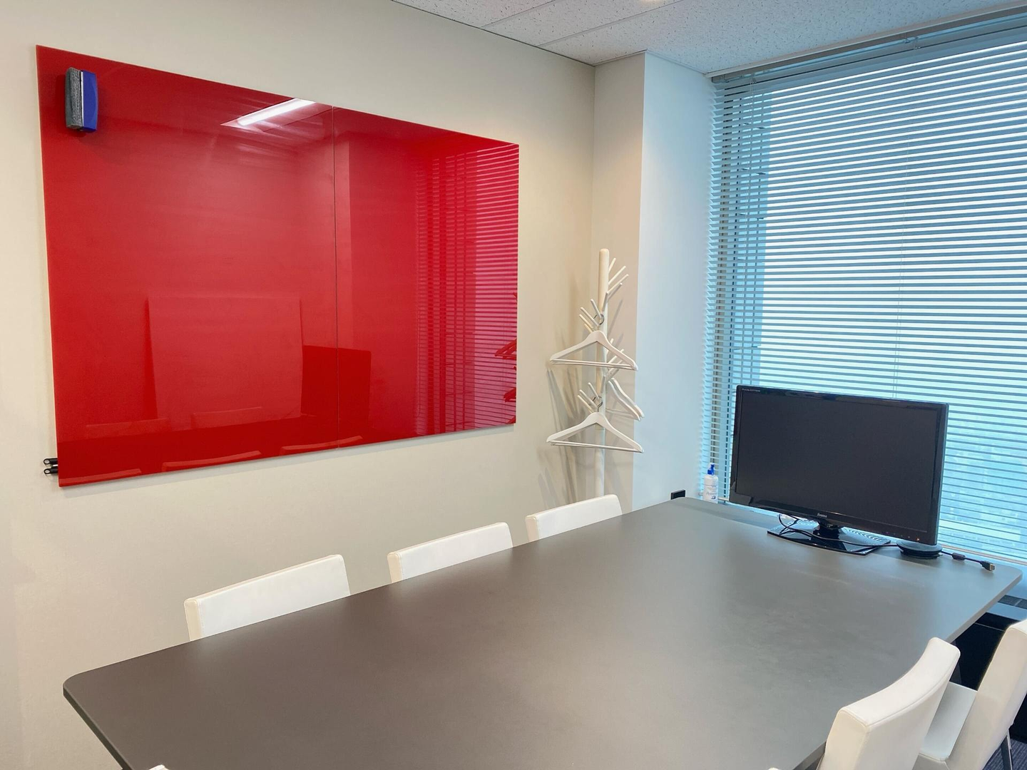 ▲コーポレートカラーの赤色にちなみ、ホワイトボードならぬレッドボード。弊社名物です。白いペンでも書けますよ。