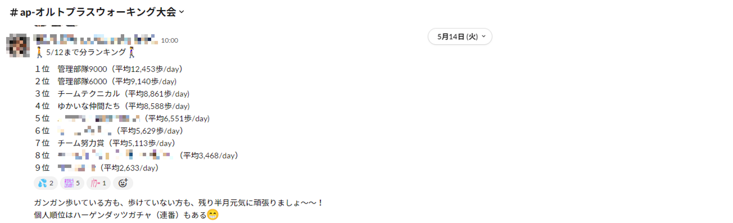 Slackのウォーキング大会専用チャンネルでは週に1度、各チームのリーダーから進捗報告がされています。先日はちょうど半分を過ぎたということで、中間ランキング発表もありました。
