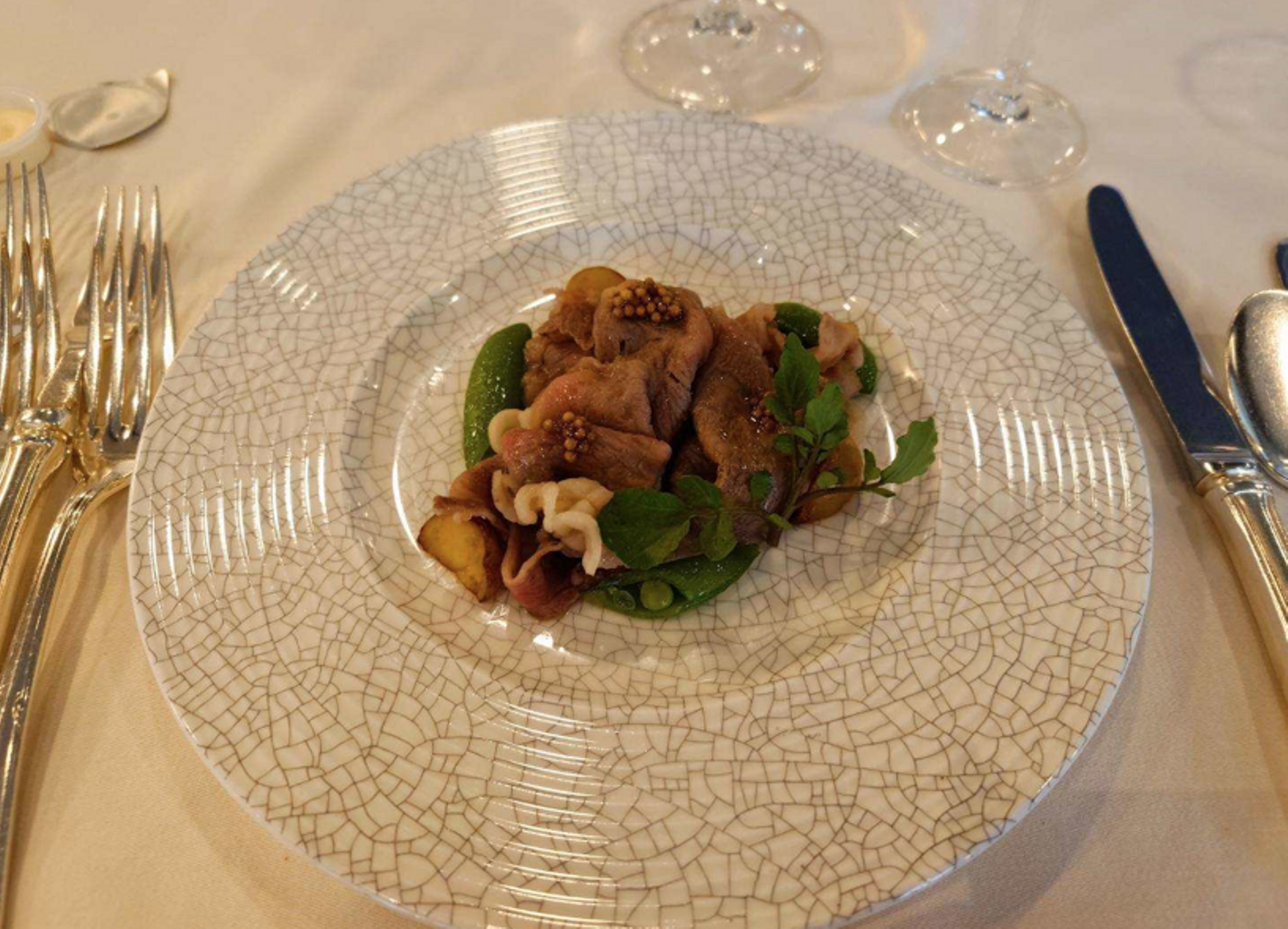 ▲温前菜 和牛ロース肉の温かいサラダ 粒マスタードとカレーオイル風味