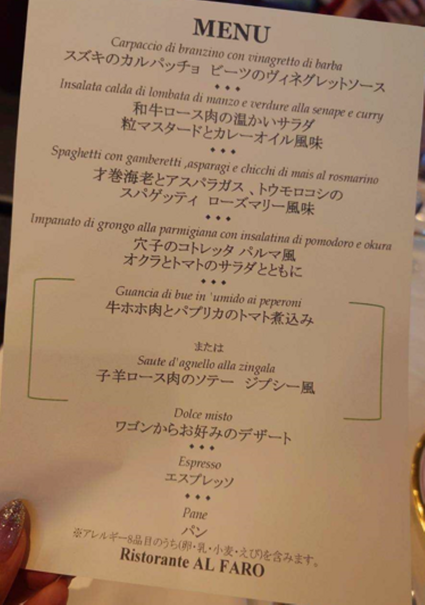 ▲冷前菜、温前菜、パスタ、魚料理、肉料理(予約時に選択)、デザート
