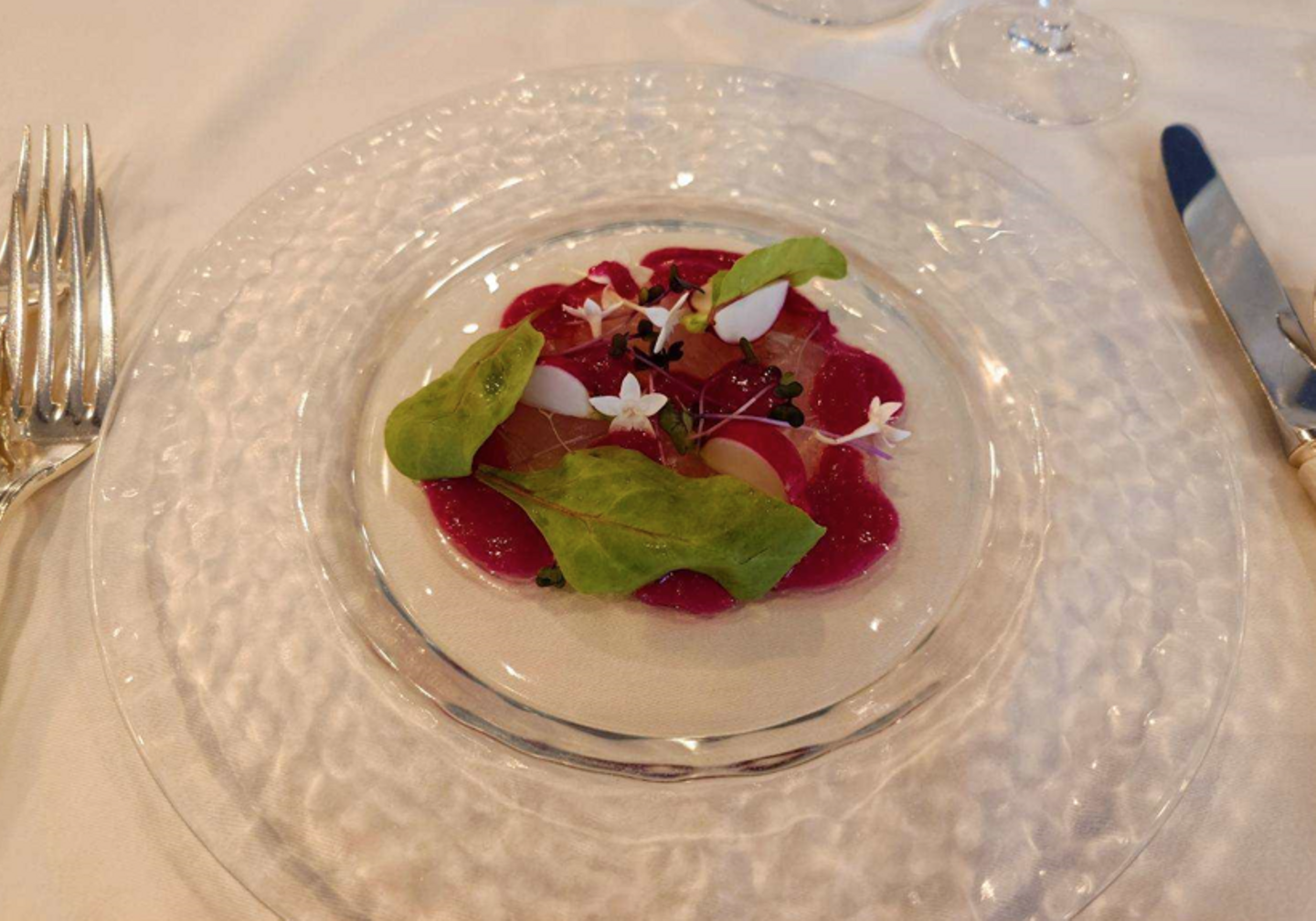 ▲冷前菜 スズキのカルパッチョ ビーツのヴィネグレットソース