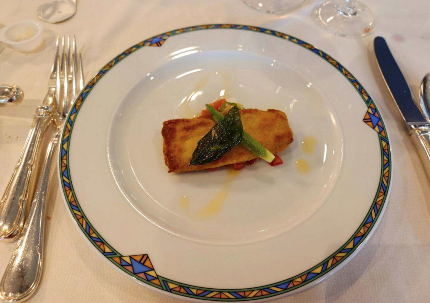 ▲魚料理 穴子のコトレッタ パルマ風 オクラとトマトのサラダとともに