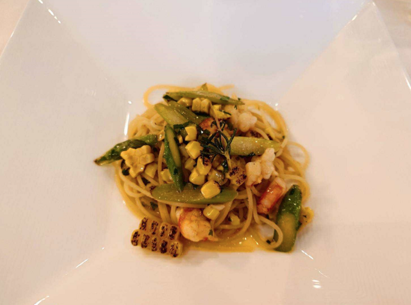 ▲パスタ 才巻海老とアスパラガス、トウモロコシのスパゲッティ ローズマリー風味