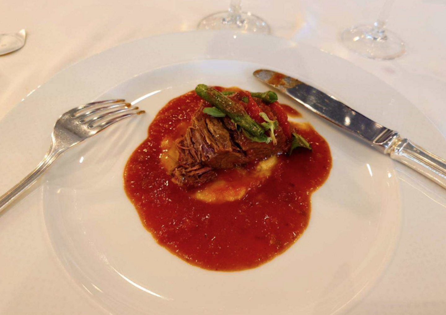 ▲肉料理(予約時に選択)A: 牛ホホ肉とパプリカのトマト煮込み