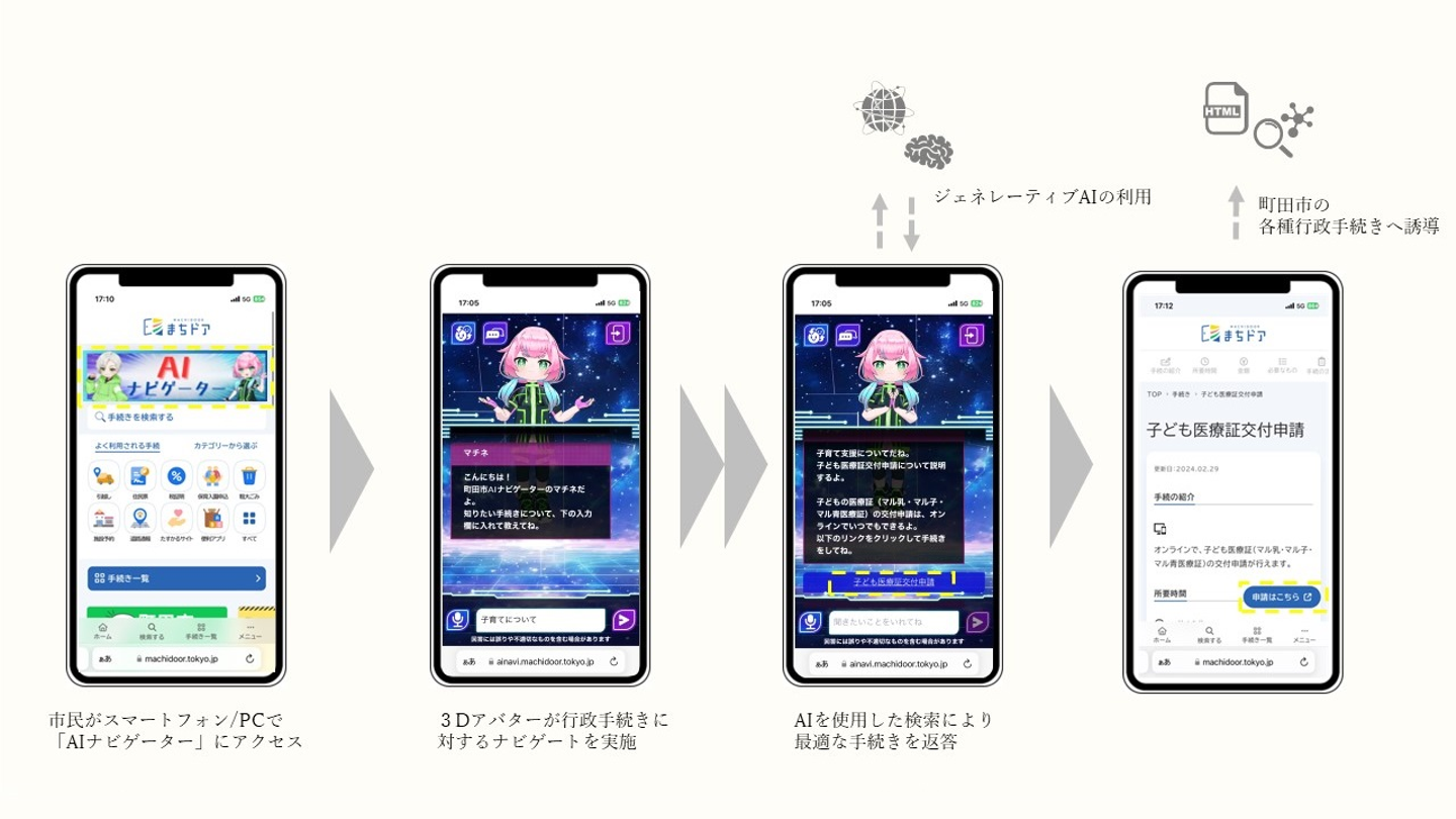 東京都町田市の様々な行政手続きを、ジェネレーティブAIと3Dアバターを活用してサポートするサービスで、株式会社NTTデータが開発を担当し、オルトプラスが利用者をサポートするAIナビゲーターのための3Dアバターの制作等を担当しました。また、アプリケーション開発においても、オルトプラスがソーシャルゲームの企画・開発・運営で培った技術とノウハウを駆使し、市民の皆様の快適な行政手続きをサポートできるよう、UI/UXの洗練と実装にも貢献いたしました。