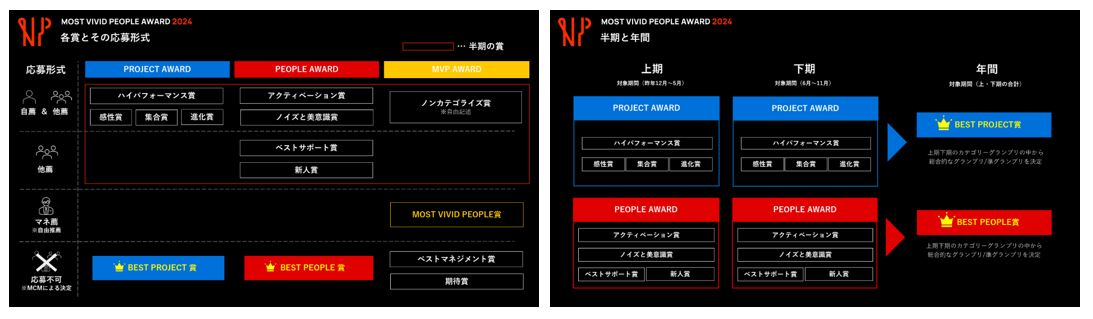 PROJECT AWARDとPEOPLE AWARDにカテゴリを分類し、それぞれに該当するamana peopleを表彰。 また、上期/下期で表彰し、その結果を元に年間のグランプリを選出します。