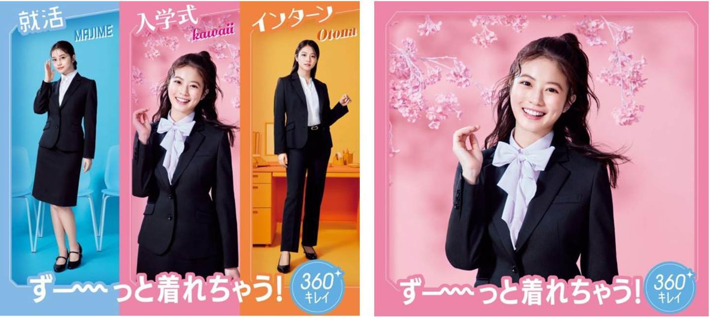 2024年春、新たなステージに進むフレッシャーズに向けたAOKIのキャンペーンがスタートしました。キャンペーンキャラクターには、女優の今田美桜さんと、セーラー服がトレードマークのタレント、イモトアヤコさんが起用され、テレビCMやウェブ限定CMでその魅力を発信。アマナは、グラフィック制作を担当し、テレビCMと連動した撮影・レタッチ・デザインを行いました。