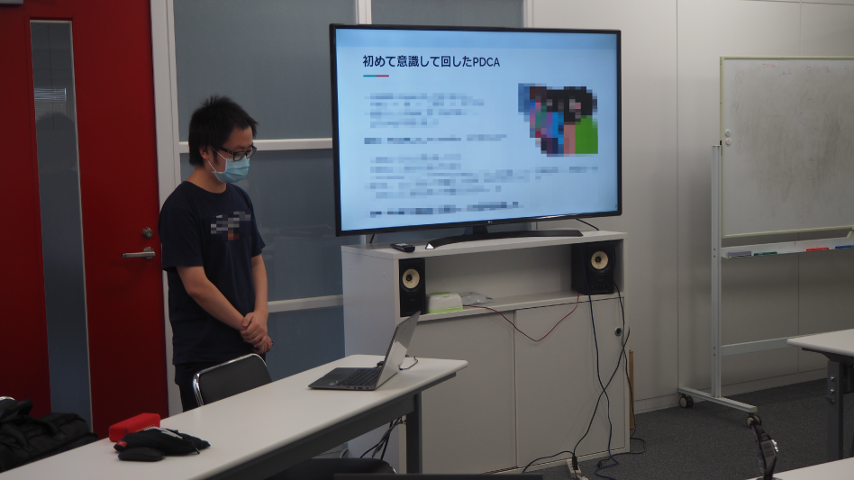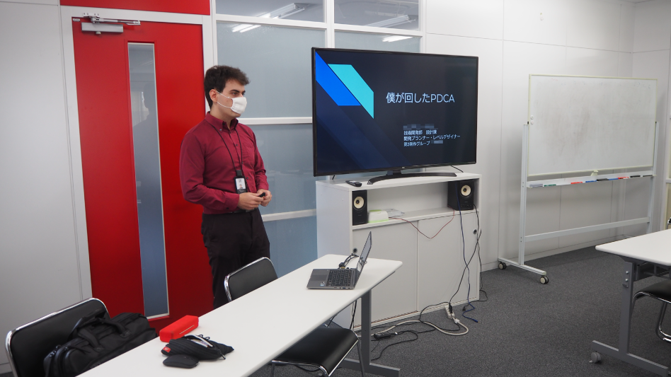 対象者が自らこれまでの業務を振り返り、PDCAをどのように実践してきたのかをプレゼン資料にまとめ、発表しました。それぞれ、工夫を凝らした(しかも日本語で!)プレゼン資料をこの日の為に準備し、先輩社員が会場やオンライン視聴で見守る中、緊張感もありつつ、堂々とプレゼンしていました。
