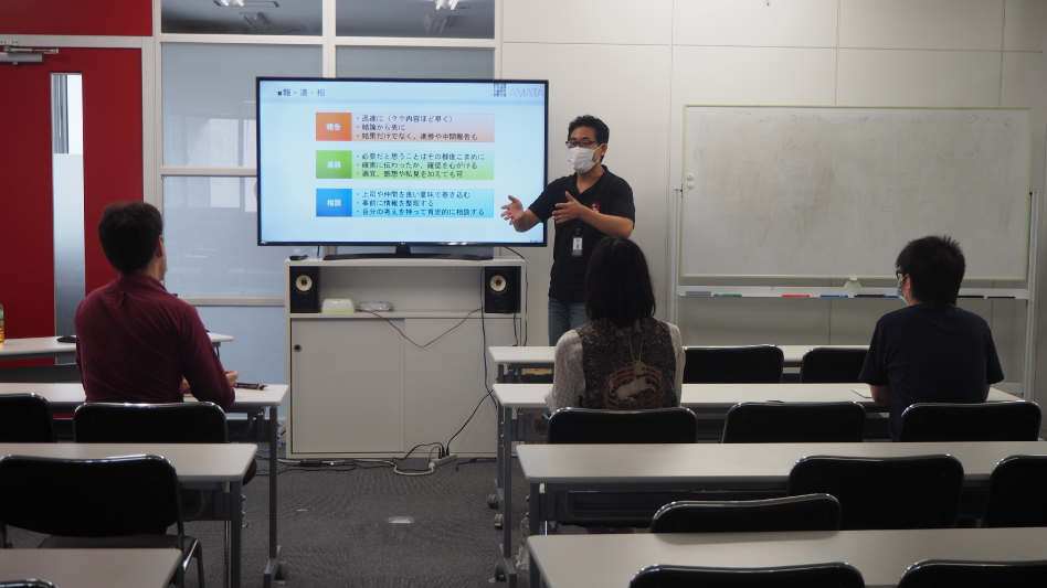 社会人・あまた社員として、約8か月を過ごしてきたメンバーにあらためて、社会人と学生の違いやビジネスマナー、ビジネスの基軸としての「PDCA」「報・連・相」「指示の受け方」を講義。
