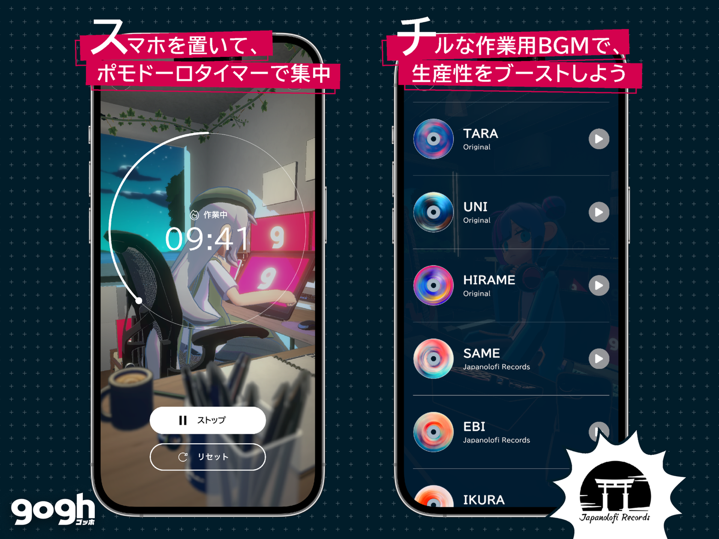 goghは、集中に適したLofi音楽、リラックスできる環境音などのASMR、休憩のリズムをサポートするポモドーロタイマー機能がひとつになった、勉強や作業のための集中支援アプリです。