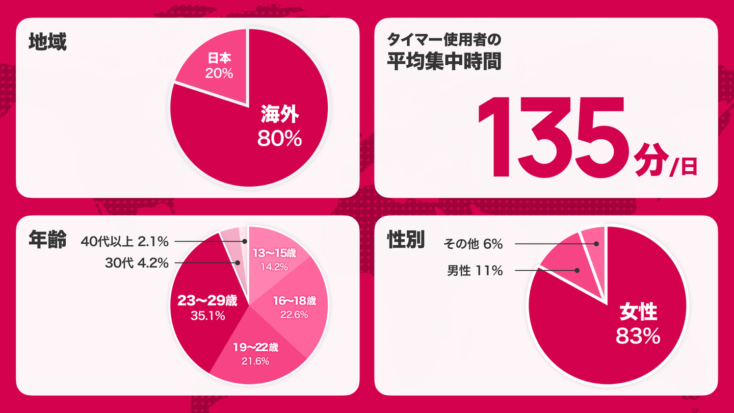 また、タイマー利用者の1日当たりの平均作業集中時間は135分となっており、作業集中のお供として長時間利用頂いています。