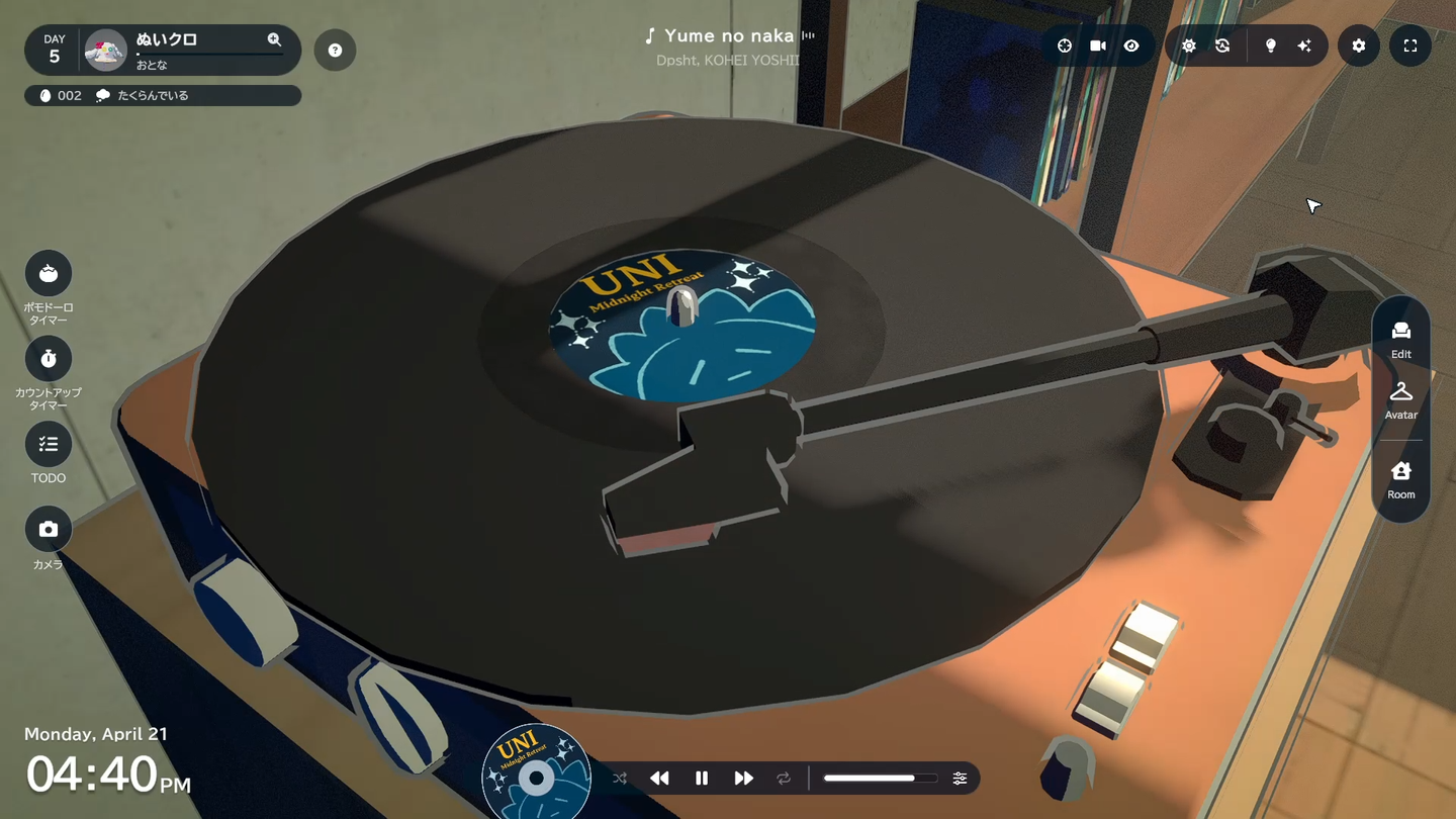 goghは現実のプレイヤー自身の作業集中を支援するゲームです。Lofiビートを中心としたチルな楽曲を多数ご利用いただけるほか、20種類の環境音やアバターの作業音などのASMRも楽しめます。また、ポモドーロタイマー、カウントアップタイマー、ToDoリストで集中管理いただけます。