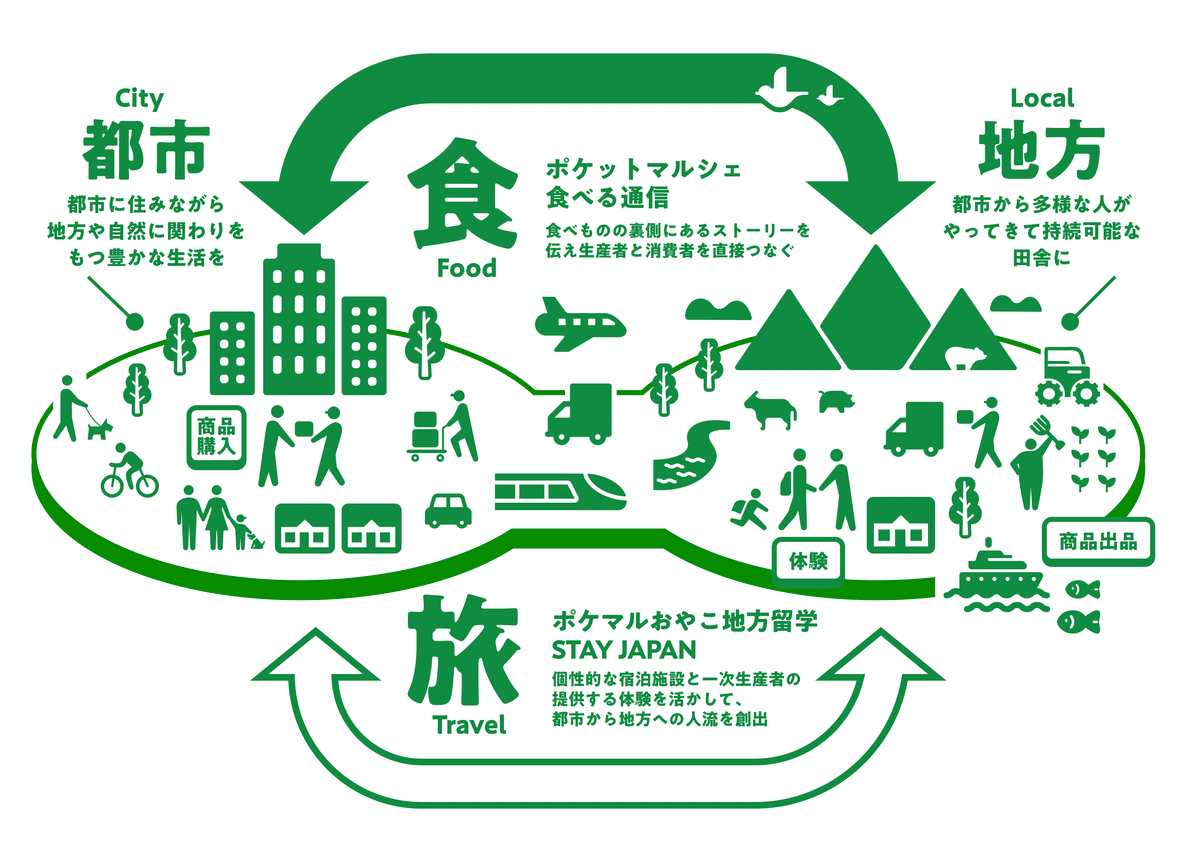 「都市と地方をかきまぜる」をミッションに、生産者と消費者が直接やり取りしながら旬の食べものを売り買いできる産直アプリ「ポケットマルシェ」、寄附者と生産者が直接つながるふるさと納税サービス「ポケマルふるさと納税」、食べもの付き情報誌「食べる通信」の運営を行うほか、小学生のお子さんと親御さんが生産者のもとで自然に触れて命の大切さを学ぶ、地方留学プログラム「ポケマルおやこ地方留学」などを展開しています。