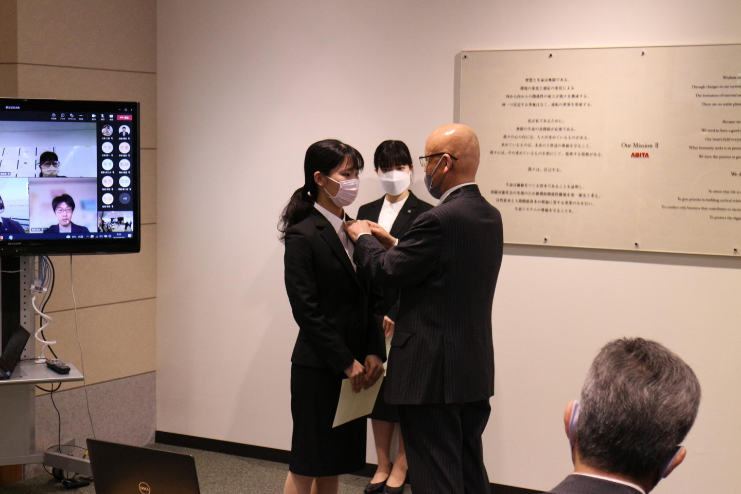 ↑社章を付ける際に代表取締役会長兼CEOの熊野からお言葉をいただきます。