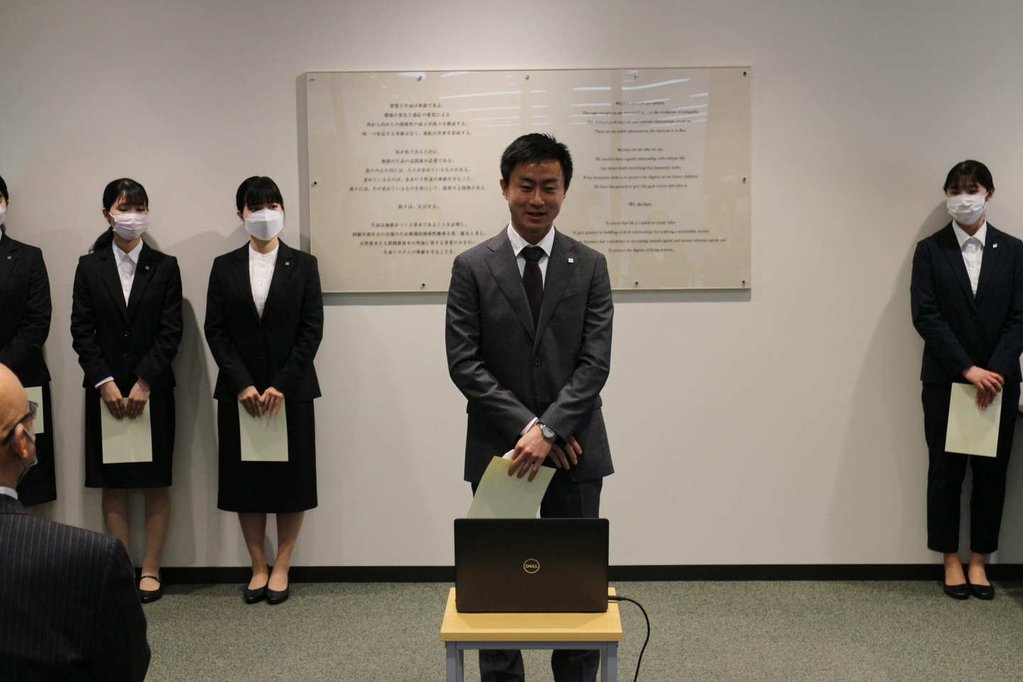入社式では、辞令の授与を行い、今年の新入社員5人から一人ずつ抱負を伝えてもらいました。