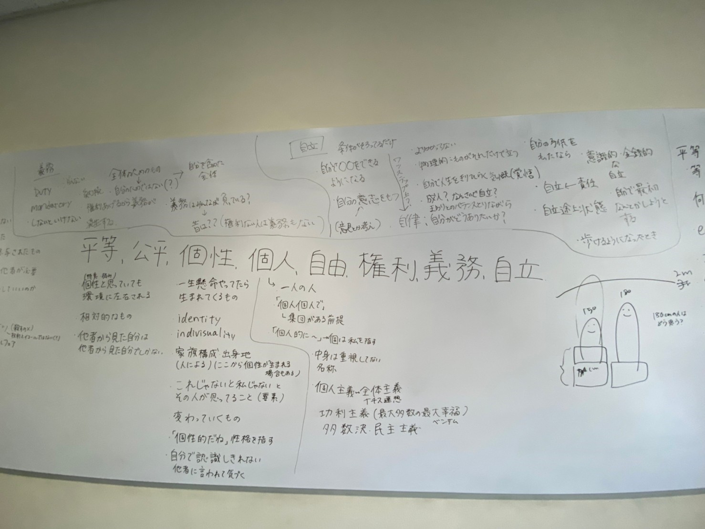 ↑新入社員研修で、言葉の意味を追求する思考訓練「レゾンデートル」を実施した際のホワイトボードです。普段は何気なく使っていた言葉について、真剣に思考しています。