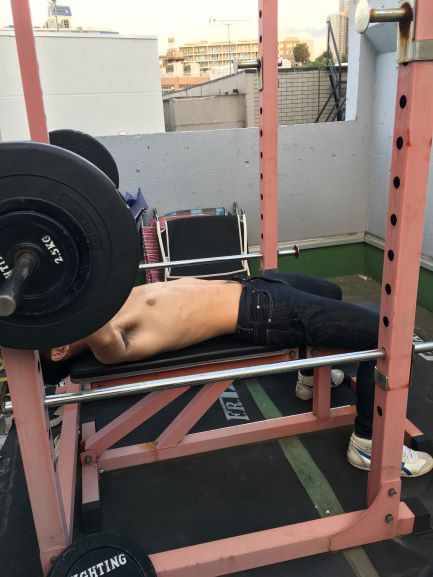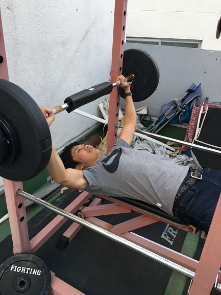エンジニアのコジマくんは自分の体重と同じ重量のウエイトでトレーニング中。(下写真)