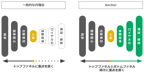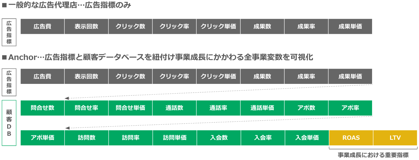 アンカー杉田:とても嬉しいお言葉です、ありがとうございます。全事業変数を可視化し、成長に最もインパクトのある指標を設定して、高速でPDCAを回して成果につなげることはアンカーの強みの一つだと思っています。リード獲得だけに注力しがちな広告業界ですが、単発の入会や購入で終わらず、その後いかに継続いただくか、ボトムファネルから逆算してLTVを最大化、全体のROAS改善を図ることを意識していますね。