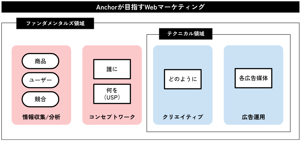 アンカー近藤:代理店ではなく、クライアント様の一員という気持ちで業界No.1の実現を支援させていただいているので、そうおっしゃっていただけてとても嬉しいです。「顧客理解」は代表千野の口癖なのですが、やはりマーケティングでは分析が一番重要だと思っています。事業計画、事業戦略はもちろん、3C分析や強み弱み、代替サービス、ほかにも多々あるのですが、ユーザーのインサイト分析はとくに力を入れていますね。