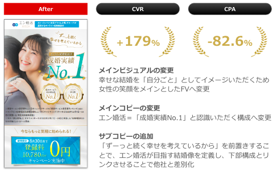 「LPの初稿から分析の深さを感じて、もっと選んでいただけそう!と確信し、配信前からワクワクしていました。」と、語るのはエン婚活エージェント マーケティング担当の横田さん。わずか3ヶ月でCVR179%増加、CPA82.6%削減まで改善できたわけとは。LPO支援実績累計4,000本、改善率98%を誇り、業界No.1実現の重要な鍵を握るアンカーのクリエイティブチームに迫ります。